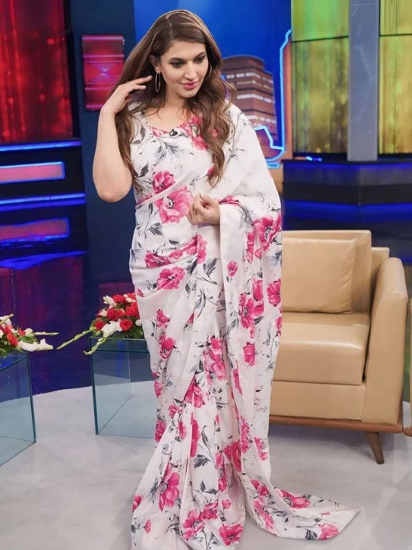 Embracing the purity of white with a dash of passion in pink, Sana Nawaz stuns in a K Yousuf designer saree. The delicate floral patterns weave a tale of innocence and fervor, while the soft curls of her hair whisper timeless grace. Her makeup, a harmonious blend of classic and modern, accentuates her features with a subtle yet impactful statement. This K Yousuf creation is not just a garment; it’s a celebration of the saree’s enduring elegance, reimagined for the contemporary woman.